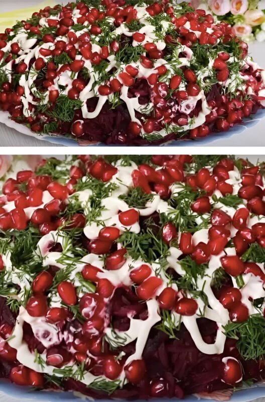 - Po to sluoksnis tarkuotų kiaušinių, majonezo ir likusių burokėlių – tai paskutinis salotų sluoksnis. Jis papuošiamas majonezo, krapų ir granatų grūdelių tinkleliu.
