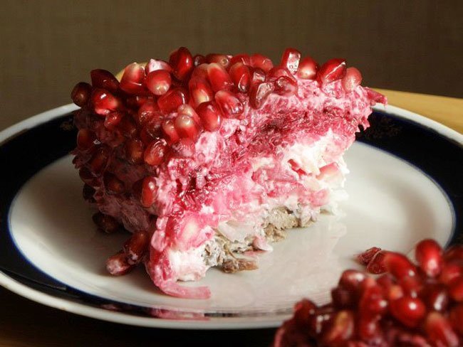 - Surinktos salotos bent 3 valandoms perkeliamos į šaldytuvą, o tada atsargiai nuimamas žiedas. Tokios salotos ne tik skanios, bet ir ryškios, su įdomia granatų rūgštele.