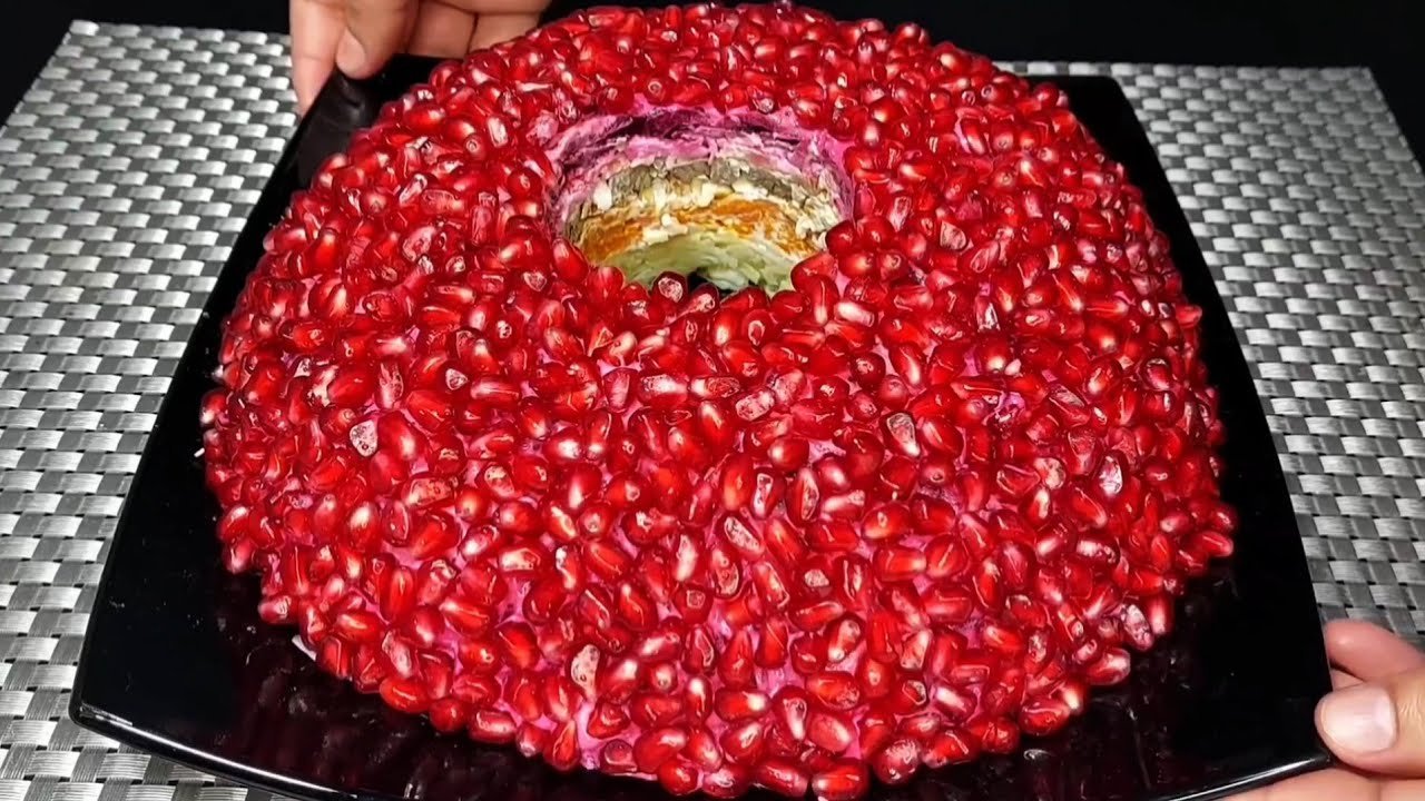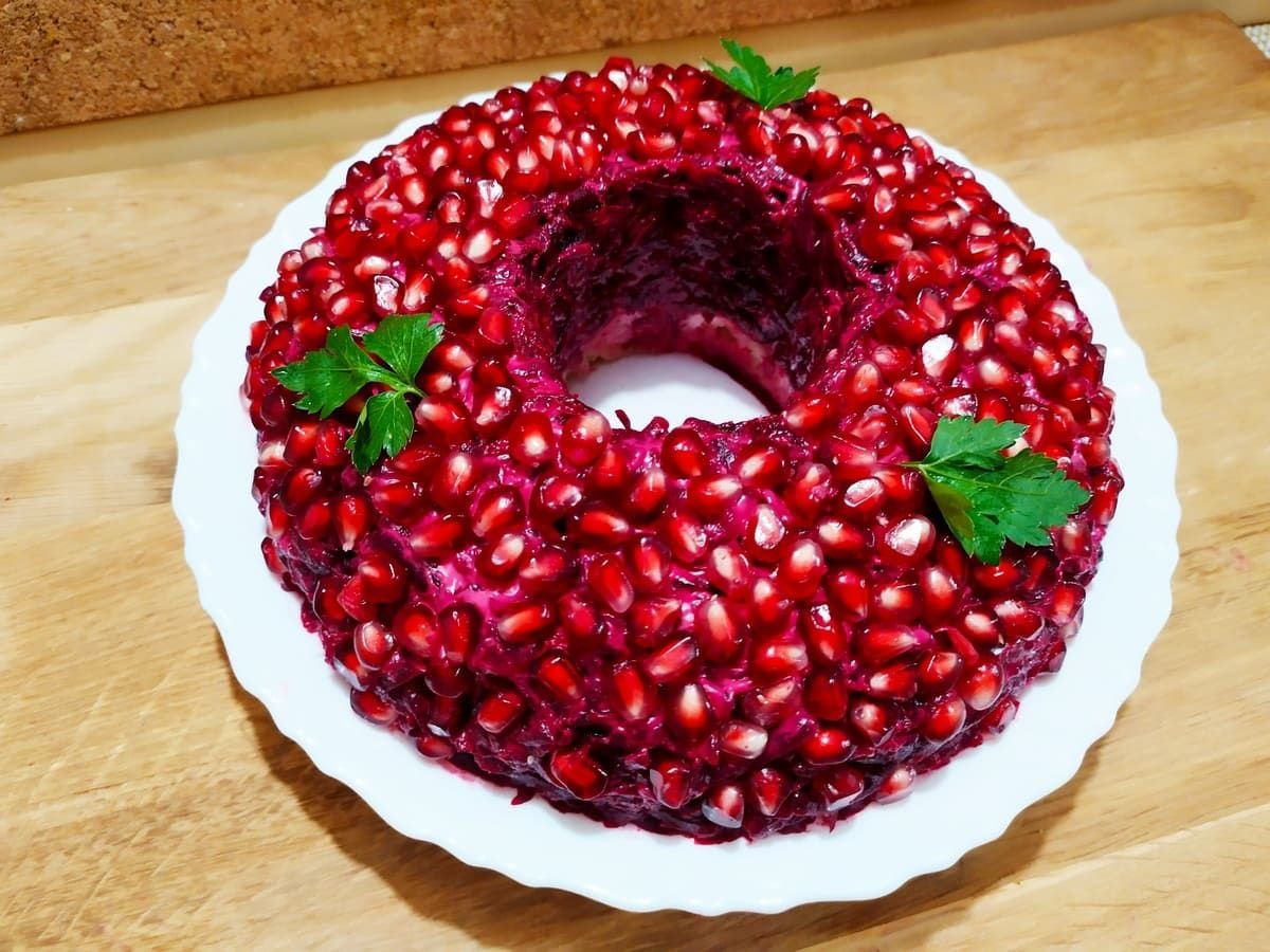- Surinktos salotos bent 3 valandoms perkeliamos į šaldytuvą, o tada atsargiai nuimamas žiedas. Tokios salotos ne tik skanios, bet ir ryškios, su įdomia granatų rūgštele.