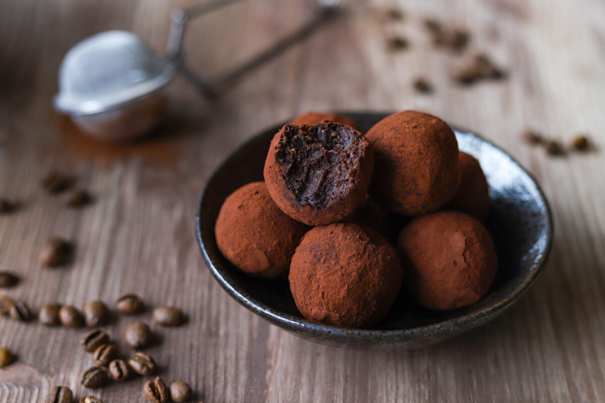 Formuojame rutuliukus ir apvoliojame kakavos milteliuose.