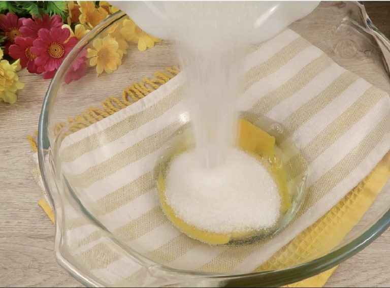 Į dubenį įmuškite kiaušinį, supilkite cukrų ir mikseriu viską išplakite į vientisą masę.