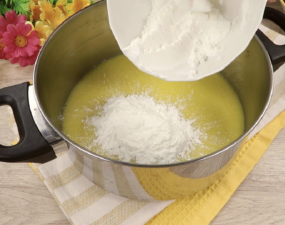 Supilkite mišinį į puodą, suberkite krakmolą, cukrų.