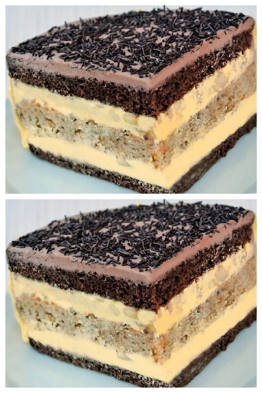 Paimkite formą, išklokite ją pergamentu. Ant dugno sudėkite tamsų pyragą. Supilkite sirupą ir aptepkite kremu. Uždėkite šviesųjį pyragą, vėl kremą ir vėl tamsųjį pyragą. Taip kaitaliokite, kol kremas ir pyragaičiai baigsis.