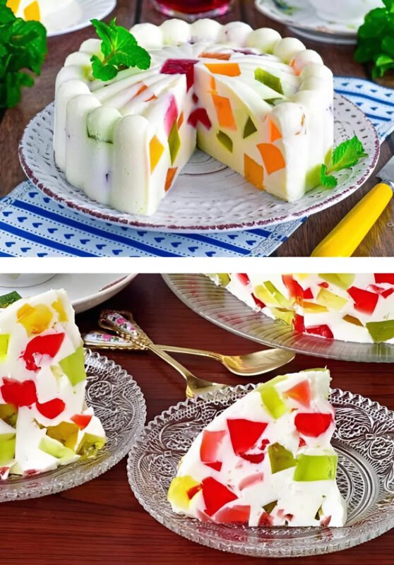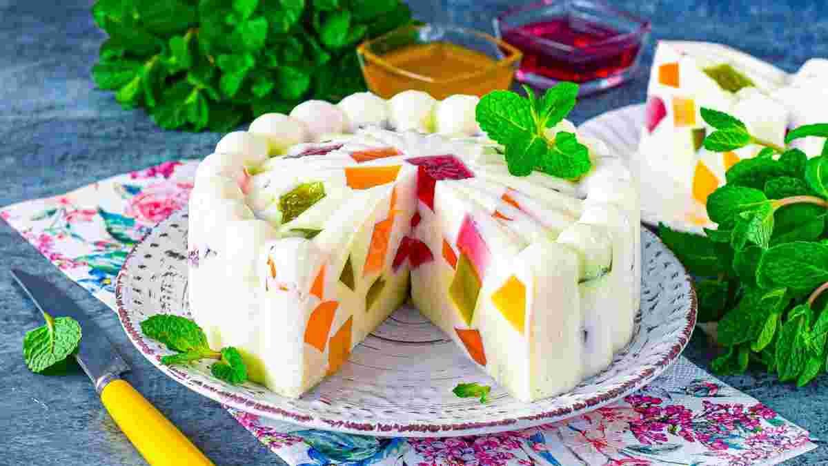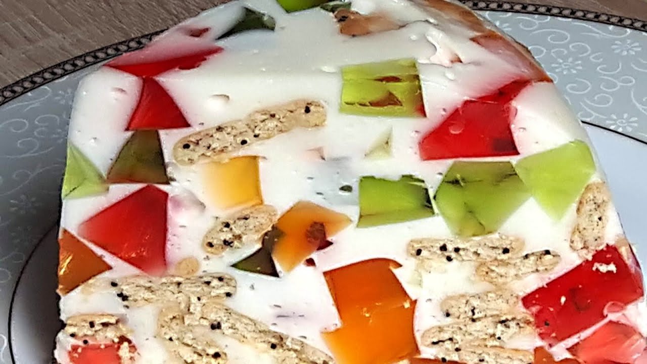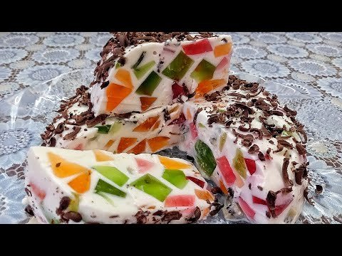 Sukietėjusią spalvotą želė supjaustykite kubeliais ir atsargiai įmaišykite į masę. - Suformuokite desertą.
