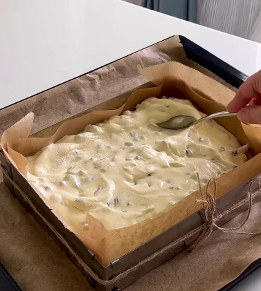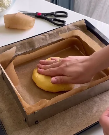 Stačiakampę formą (maždaug 20×25 cm) išklokite popieriumi. Tešlą paskirstykite ant dugno, nepamiršdami kampų. Jei naudojate slankiojančią formą, pritvirtinkite ją, kad kaitinant nesideformuotų.