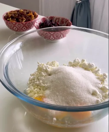 Sumaišykite varškę, kiaušinius, grietinę, cukrų, vaniliną ir krakmolą. Mišinį trintuvu paverskite vientisa mase. Sudėkite džiovintus vaisius, prieš tai išmirkytus ir išdžiovintus. Išmaišykite šaukštu.