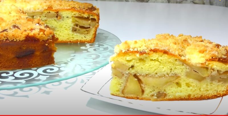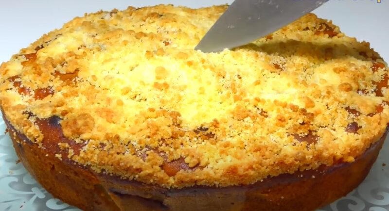 Paruoštą pyragą šiek tiek atvėsinkite ir apibarstykite trupiniais. Patiekite šiltą su arbata. Pyragas gaunasi minkštas, purus viduje, su sultingu įdaru ir traškia plutele.