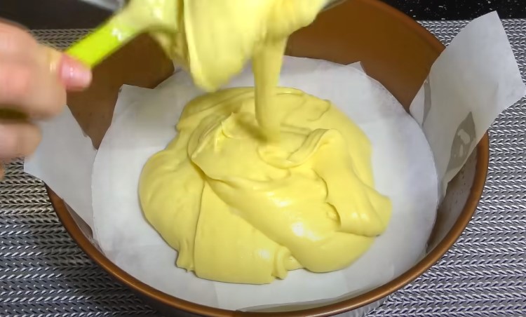 Kiaušinių baltymus atskirti dubenyje, trynius išplakti atskirai. Į baltymus įberkite 0,5 šaukštelio druskos. Maišytuvu viską paverskite į sodrias putas. Toliau plakant supilti vaniliną, tada cukrų. Kai viskas pavirs stabiliomis putomis, įmaišykite po vieną trynį. Toliau plakite. Kai gausite vientisą masę, upeliais supilkite augalinį aliejų. Sudėkite grietinę, išmaišykite ir išjunkite maišytuvą.