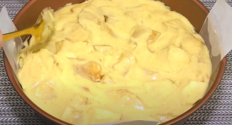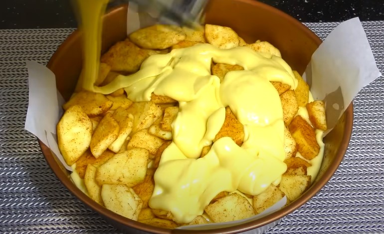 Į formą supilkite didžiąją dalį tešlos. Tolygiai paskirstykite. Apibarstykite obuoliais ir sukrėskite likusią tešlą. Šiek tiek pakratykite formą, kad tešla prasiskverbtų pro obuolius.