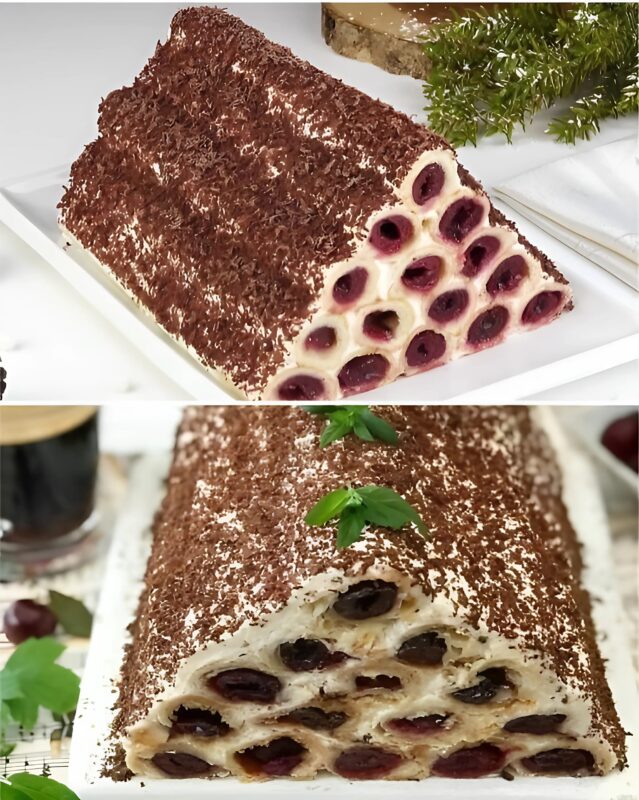 Praėjus šiam laikui kiekvieną gabalėlį iškočiokite į 30*20 cm stačiakampį. Kiekvieną padalykite į tris juosteles. Ant jų glaudžiai viena ant kitos sudėkite vyšnias. Kraštus suvyniokite į vamzdelį ir suspauskite.