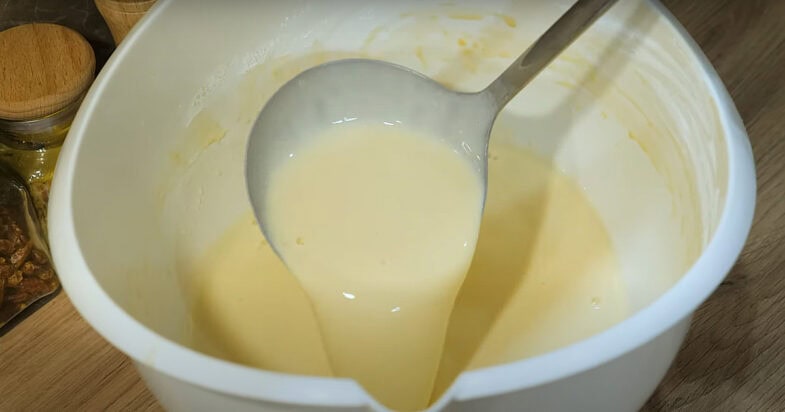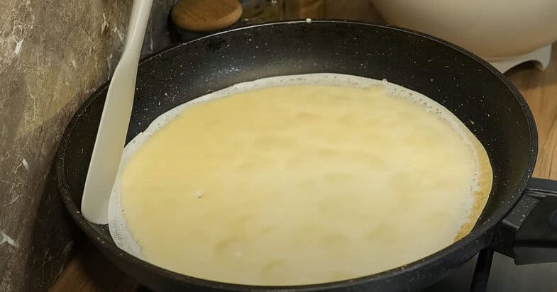 Išplakite kiaušinius su cukrumi ir druska. Dalimis persijokite miltus ir krakmolą ir išmaišykite iki vientisos masės. Palaipsniui supilkite pieną, nuolat maišydami, kad neliktų gumuliukų. Supilkite sviestą ir dar kartą išmaišykite. Atidėkite į šalį 20 minučių.