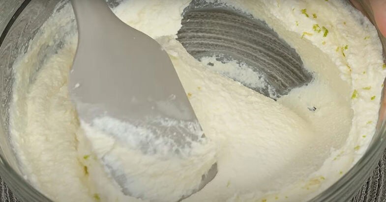 Varškę suplakite trintuvu, suberkite cukraus pudrą, vanilinį cukrų ir žievelę. Kruopščiai išmaišykite