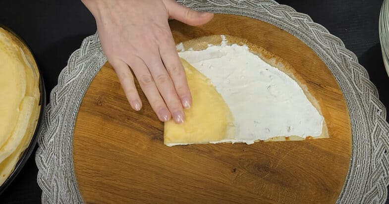 Kiekvieną blyną perpjaukite pusiau. Kiekvieną pusę aptepkite varškės įdaru ir susukite. Mėgaukitės desertu.