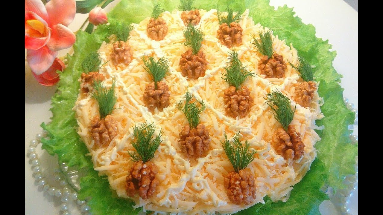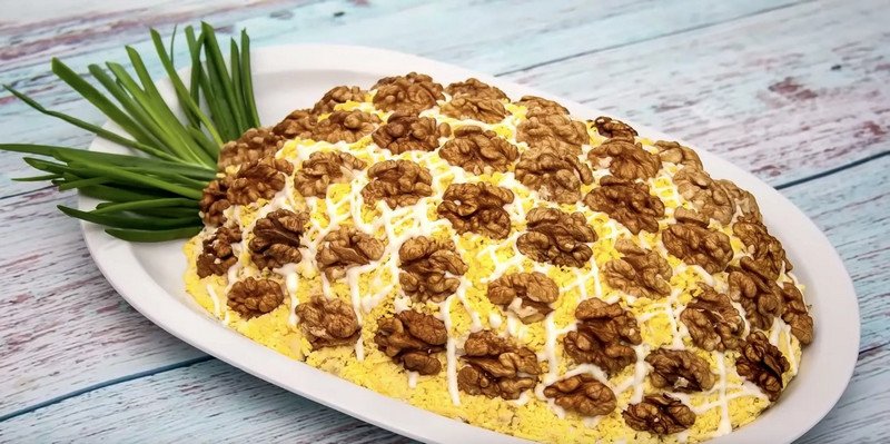 Pradedame rinkti. Ovalo formos lėkštėje pirmuoju sluoksniu išdėliojami kepti grybai, tada – vištienos filė. Palaipsniui suteikite salotoms formą, panašią į ananaso. Kitas sluoksnis – ananasų gabalėliai. Sūris, sumaišytas su majonezu ir kiaušiniu, padengia visus salotų paviršius, įskaitant šonus. Majonezo tinklelis, ant viršaus esančios riešutų puselės primena ananaso žvynus, o žalieji svogūnai simbolizuoja vaisiaus uodegą.