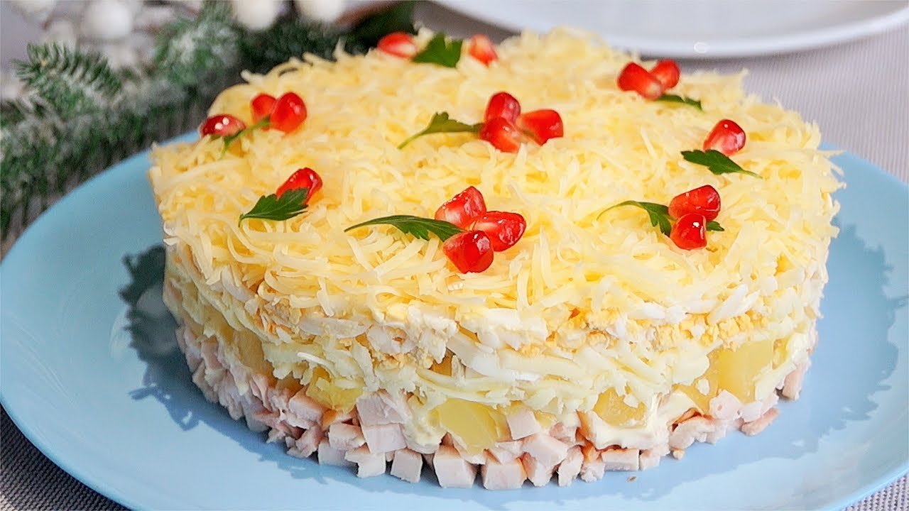 Vištienos filė ir kiaušiniai supjaustomi mažais kubeliais, o ananasas (jei jis šviežias) nulupamas ir supjaustomas nedideliais gabalėliais. Taip pat iš ananasų ir grybų nusausinkite skysčio perteklių, naudodami durtuvą. Sūris sutarkuojamas smulkia tarka ir sumaišomas su kiaušiniais bei majonezu, taip sudarant kito salotų sluoksnio pagrindą. Vištiena užpilama majonezu, jei reikia, įberiama šiek tiek pipirų.