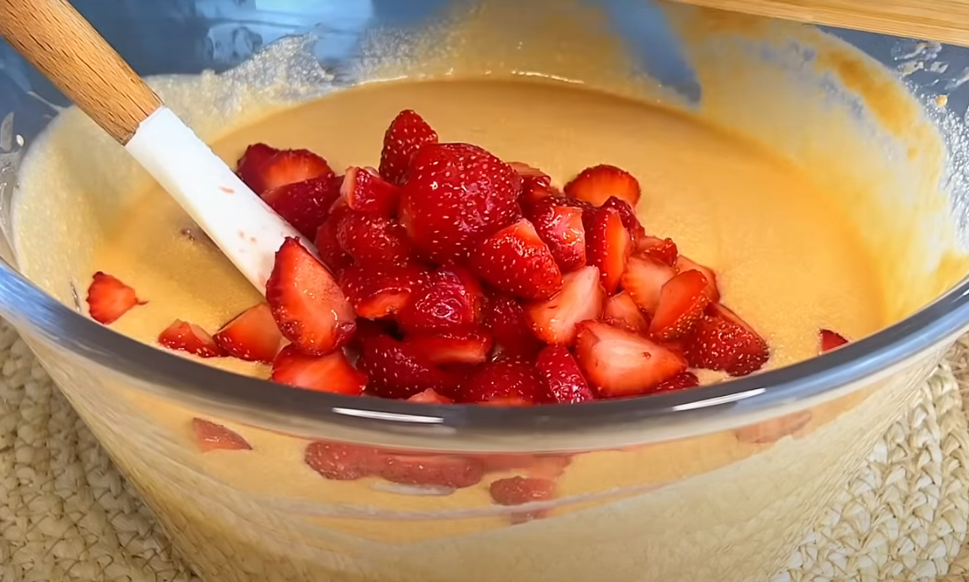 Įmaišykite braškes. Masę perkelkite į formą, uždengtą maistine plėvele, arba paskirstykite į kremus.
