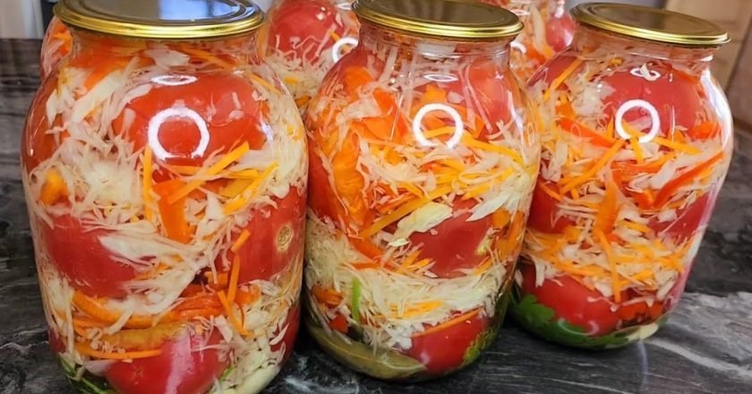Pirmiausia smulkiai supjaustykite kopūstus. Nuplaukite ir nusausinkite pomidorus. Sterilaus trijų litrų talpos stiklainio dugną išklokite kopūstų sluoksniu, įdėkite porą lauro lapų ir kelis žirnelius pipirų. Tada sudėkite eilę pomidorų. Daržoves kaitaliokite tol, kol stiklainis bus pripildytas iki pat viršaus.
